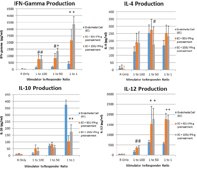 Figure 4: IFN-Gamma pretreated placental endothelial cells evoke Th1-Like response in MLR. Placental endothelial cells were treated for 48 hours with dilution buffer (control) 50 or 100 IU interferon gamma and mitotically inactivated by irradiation. Cells were plated at the indicated stimulator:responder ratio in round bottom 96-well plates and cultured for 48 hours, after which production of the indicated cytokines was assessed by ELISA (*p < 0.01 as compared to control; #p < 0.05 as compared to control)