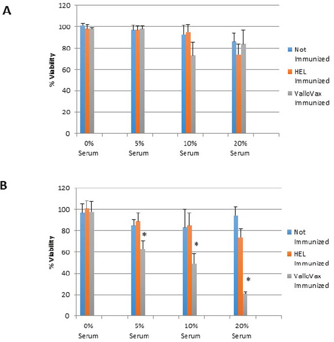 Figure 5: Selective killing of tumor endothelial cells by sera from ValloVax immunized mice. Sera was collected from C57/BL6 mice that were either: unimmunized; immunized with HEL; or immunized with ValloVax. Sera was incubated with either healthy bone marrow derived endothelium A. or bone marrow derived tumor-like endothelium B. Viability was represented as percentage of absorbance with untreated cells. Six mice per group were utilized and in vitro culture was representative of triplicate experiments performed at least 3 times (*p < 0.01 as compared to control).