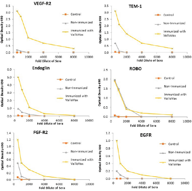 Figure 6: Antibody responses to tumor endothelial markers. Sera from ValloVax immunized mice was used as a source of antibodies for quantification using ELISA detecting binding to indicated protein. Results are from sera of 6 mice per group and performed in triplicate.