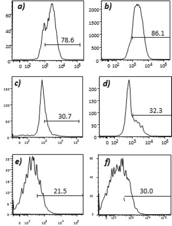 Figure 7: Expression of tumor endothelial markers on umbilical endothelial cells prior to interferon gamma treatment. Purified CD31 endothelial cells were stained with; A. anti-VEGFR2; B. TEM-1; C. Endoglin; D. ROBO; E. FGF-R2; and F. EGF-R. Cells were gated on FSC and SSC and analyzed for the respective markers.