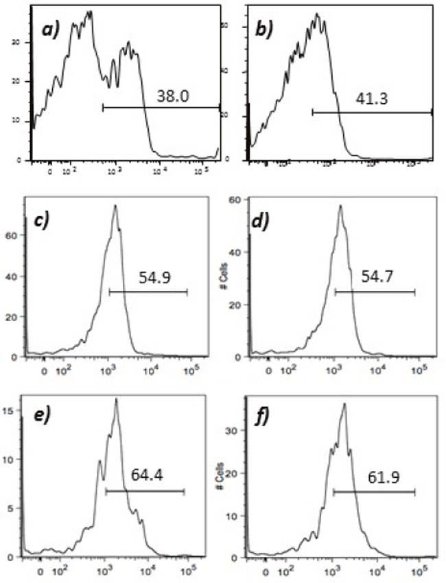 Figure 8: Expression of tumor endothelial markers on umbilical endothelial cells subsequent to interferon gamma treatment. Purified CD31 endothelial cells were cultured for 48 hours in the presence of 100 IU/ml of interferon gamma and subsequently stained with; A. anti-VEGFR2; B. TEM-1; C. Endoglin; D. ROBO; E. FGF-R2; and F. EGF-R. Cells were gated on FSC and SSC and analyzed for the respective markers.