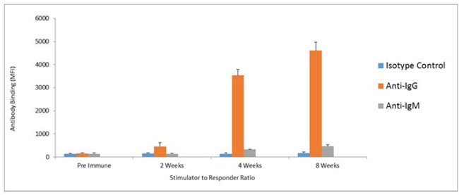 Humoral responses were assessed using an in house generated ELISA for antibody responses to VEGFR1, TEM1, CD105, ROBO, FGFR2 and EGF-R. Although varying degrees of antibody responses were seen, all animals demonstrated a significant induction of antibody generation as seen in Figure 6. We confirmed expression of these antigens on placental endothelial cells prior to treatment with interferon gamma (Figure 7), and subsequent to treatment (Figure 8). In order to identify whether antibodies generated in immunized mice actually bound to ValloVax cells, sera from immunized mice was collected at various timepoints post immunization and incubated with ValloVax cells. Characterization of antibody isotype binding was performed using anti-IgG and anti-IgM secondary antibodies. As seen in Figure 9, significant binding of IgG was noted, and antibody generation was time-dependent.