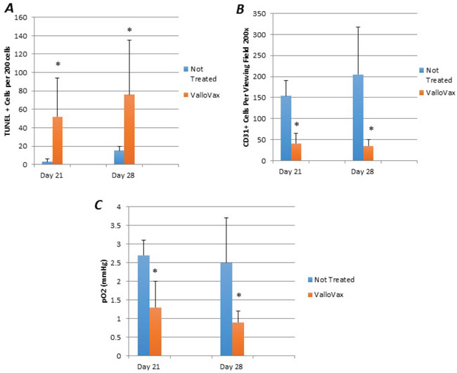 Although previous studies have demonstrated inhibition and regression of tumor growth, mechanisms of tumor regression were investigated. Animals implanted with LLC tumors were immunized and sections where made to assess apoptosis with TUNEL staining. As seen in Figure 10A, an increased number of apoptotic cells were seen within the tumor tissue. Morphologically, apoptotic cells appeared to line the area adjacent to the blood supply of the tumor. Furthermore, quantification of tumor endothelial cells by CD31 staining revealed a reduced number of endothelial cells in the tumors, which correlated with tumor growth in Figure 10B. In order to definitively elucidate whether inhibition of tumor growth was occurring as a result of reduced oxygen supply, oximetry studies were conducted. Figure 10C illustrates reduction in oxygen content of ValloVax treated tumor bearing mice as compared to control.