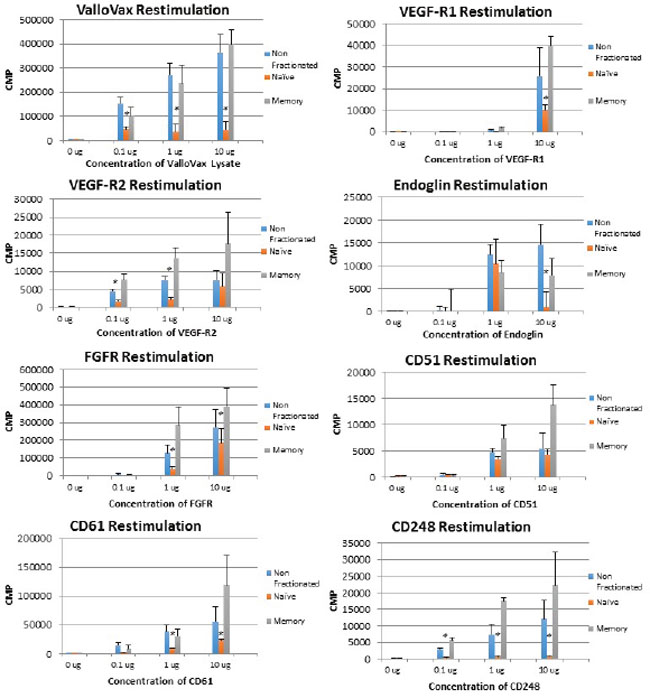 Figure 13: Memory T cell proliferation responses to tumor endothelial markers. T cells were extracted from ValloVax immunized mice and separated into memory and naïve phenotype. Proliferation in response to indicated antigen is provided in CPM. Results are from lymphatic tissue of 6 mice per group and performed in triplicate (*p < 0.01 as compared to control).