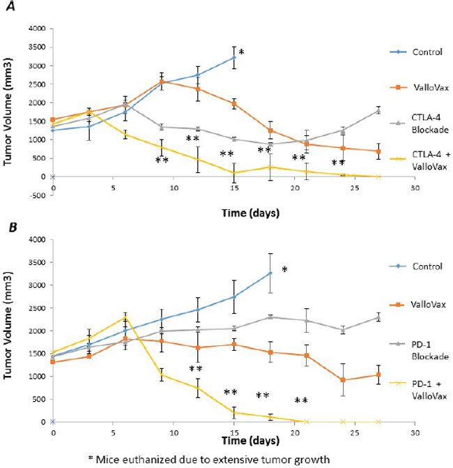Figure 15: Enhancement of ValloVax activity by checkpoint inhibition. Mice were implanted with LLC tumors, which were allowed to establish prior to immunization with ValloVax together with anti-CTLA4 A. or Anti-PD1 B. Tumor regression was assessed and each number indicates 12 animals per group. (*Animals were euthanized because of excessive tumor growth. ** p < 0.01 as compared to control, # p < .05 as compared to control).