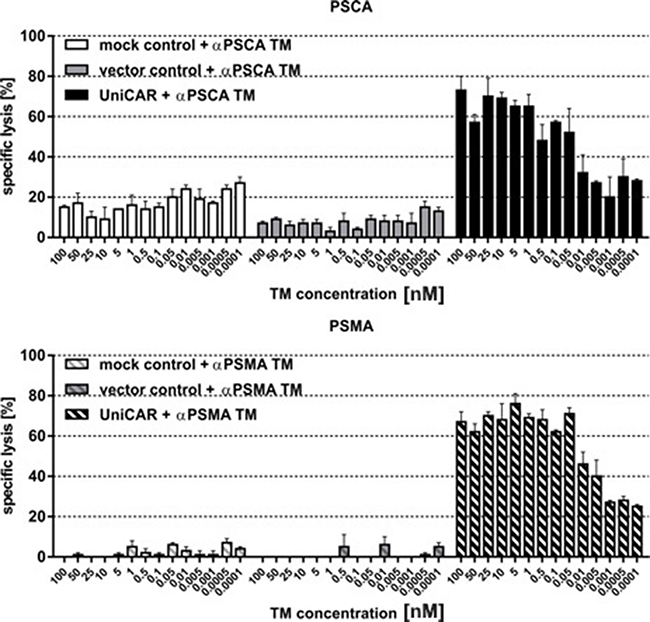 Killing of PSCA and PSMA positive PCa cells by retargeted UniCAR T cells occurs in a TM-dependent and target-specific manner with an efficacy comparable to conventional CARs