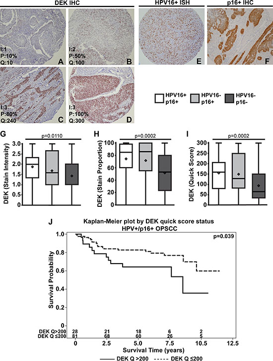 Compared to normal tissue, DEK expression is upregulated in most surveyed tumor types, including breast [58, 59], hepatocellular carcinoma [60], colorectal cancer [61], and, recently, OPSCC [50]. Our previous study found that DEK protein was highly expressed in all of a small subset of 21 HPV+ and HPV– OPSCC samples that were analyzed [50]. To validate these initial results and establish a more refined relationship between DEK expression and HPV status, we surveyed a large population of OPSCC patients using an established set of primary OPSCC tissue microarrays (TMAs). We first examined the association of DEK with HPV based on p16 (CDKN2A) status and HPV16 genome in-situ hybridization (ISH). Following this analysis, the association of DEK with IL6 expression was also tested. IL6 is a pro-inflammatory interleukin that is strongly associated with poor overall OPSCC patient survival [62] and increased risk of metastasis [63]. Even though IL6 was found to be transcriptionally downregulated following loss of DEK in HNC tissue culture models [64], a link between DEK and IL6 expression in patient OPSCC tumors has yet to be elucidated.