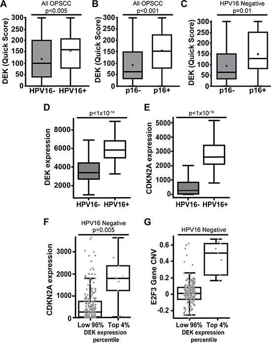 DEK mutations cannot explain the observed disparities between HPV16+ versus HPV16- disease. Such mutations are rare in all tumors, and found in only 0.4% of OPSCC. Specifically, we analyzed the TCGA provisional head and neck cancer study, and only 2 out of 530 tumors harbored mutations within the DEK gene. The first was an E20V substitution, and the second was a nonsense frameshift at amino acid 11. No DEK mutations were identified in the 279 samples previously published by TCGA [23].