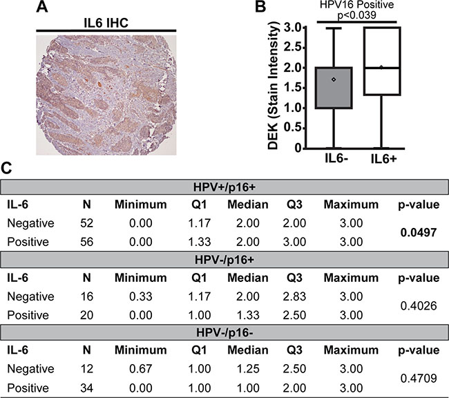 Figure 3: High DEK expression was associated with IL6 expression in HPV16+ tumors. A representative IL6+ staining section is shown (A). HPV16+ tumors that were also IL6+ stained darker for DEK than tumors not expressing IL6 (B). There was no association between DEK and IL6 status in HPV16-/p16+ or HPV16–/p16– tumors (C).