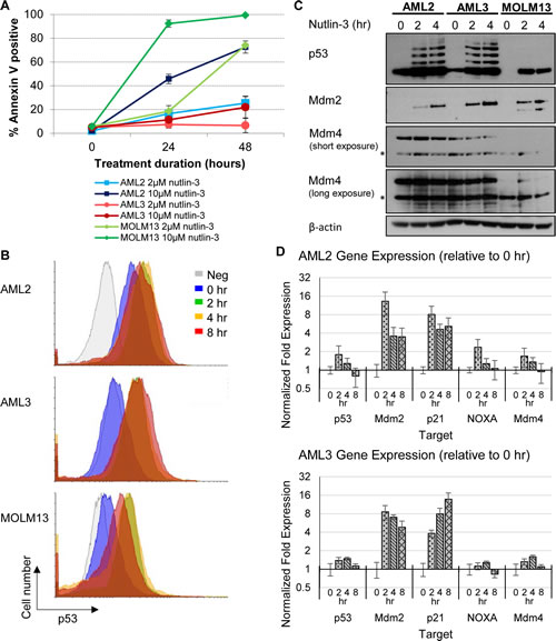 Figure 1: Differential p53 and apoptotic response of AML cell lines towards nutlin-3, with AML2 cells having high basal p53 levels. (A) AML2, AML3 and MOLM13 cells were treated with 2µM or 10µM nutlin-3 for 24 or 48 hours. The cells were stained with Annexin V-Cy5 and analysed by flow cytometry. (B) AML2, AML3 and MOLM13 cells treated with 10µM nutlin-3 for 0, 2, 4, and 8 hours were stained with mouse anti-p53 (DO-1) primary antibodies (or mouse normal IgG as a negative control) and goat anti-mouse AlexaFluor488 secondary antibodies. The p53 levels in the cells were then analysed by flow cytometry. (C) AML2, AML3 and MOLM13 cells were treated with 10µM nutlin-3 for the indicated durations and were lysed and immunoblotted with the respective antibodies. * indicates non-specific bands. (D) RNA was harvested from AML2 and AML3 cells treated with 10µM nutlin-3 for 0, 2, 4, or 8 hours and reversed transcribed for quantitative PCR for the indicated genes
