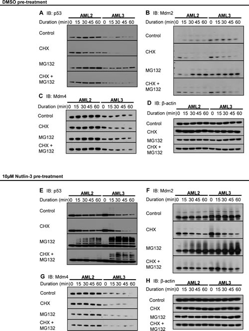 Mdm2 in both cell lines behaved as expected after nutlin-3 withdrawal (Figure 2F). The half-lives of Mdm2 in both AML2 and AML3 were similar, and the level of ubiquitination were comparable. However, the levels of Mdm4 between the two cell lines were different, with Mdm4 in AML3 being rapidly degraded (Figure 2G). On the other hand, Mdm4 levels in AML2 remained steady throughout the entire interval, even in the presence of CHX and/or MG132. Figure 2H shows the β-actin loading control.