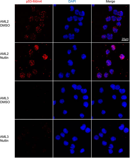 To reaffirm the findings of a higher level of p53-Mdm4 interaction in AML2, a proximity ligation in situ assay (PLISA) for the interaction was performed (Figure 4). As each PLISA spot corresponds to an interaction event, there was a greater amount of p53-Mdm4 interaction in AML2, with or without nutlin-3 treatment. In contrast, the p53-Mdm4 interaction in AML3 was exceedingly low, and only slightly increased in response to nutlin-3 treatment. It is interesting to note that in AML2, most of the interactions occur outside the nucleus in the cytoplasm. This observation reinforces the hypothesis that Mdm4 sequesters and inactivates p53 by localising it in the cytoplasm, as observed by the overexpression of nuclear localisation mutants of Mdm4 [23].
