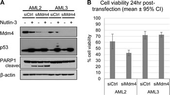 Figure 5: Knockdown of Mdm4 induced cell death in AML2, but not in AML3. (A) AML2 or AML3 cells transfected with non-targeting siRNA (siCtrl) or siRNA against Mdm4 (siMdm4) for 24hr before treatment with 10µM nutlin-3 (or DMSO) for 4hr, and blotted for the indicated proteins. (B) Cell viability of AML2 and AML3 cells 24hr post-transfection with siCtrl or siMdm4, as assayed by PI exclusion.