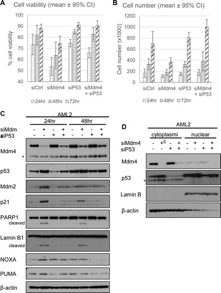 Figure 6: Knockdown of p53 rescues Mdm4 depletion-induced cell death in AML2. AML2 cells were transfected with siCtrl or siMdm4 and/or siP53 and (A) cell viability and (B) cell numbers were analysed 24, 48 and 72 hours post-transfection. Similarly treated AML2 cells were lysed (C) or separated into cytoplasmic or nuclear fractions (D) and analysed for the indicated proteins by Western blot. * indicates non-specific bands.