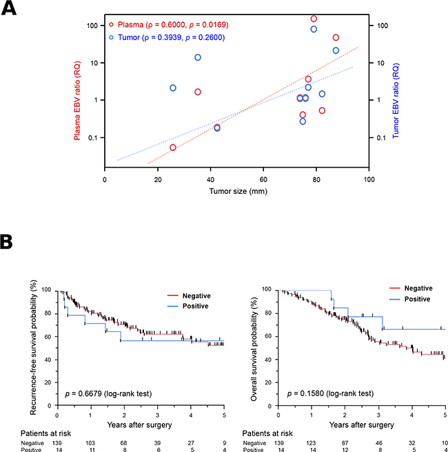 Figure 1: Potential of plasma Epstein-Barr virus (EBV) ratio for use in the detection of EBV DNA in cell-free DNA (cfDNA) samples. (A) Relationship between tumor size and the EBV ratio in patients with gastric cancer (GC). Red and blue circles represent plasma and tumor EBV ratios for each patient, respectively. Plasma EBV ratios were significantly correlated with tumor sizes in patients with GC (ρ = 0.600, p = 0.0169, Spearman’s correlation); however, tumor EBV ratios were not (ρ = 0.3939, p = 0.2600). RQ; relative quantitative value. (B) Kaplan-Meier curves for recurrence-free survival rates (left) and overall survival rates (right) of GC patients according to the presence of EBV DNA in the plasma. The log-rank test was used for statistical analysis. P < 0.05 was considered statistically significant.