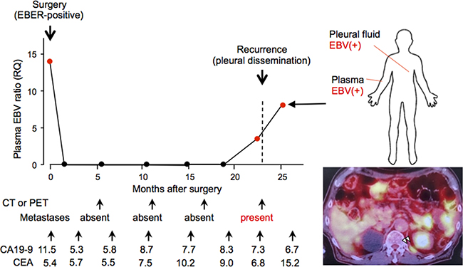 Figure 3: Longitudinal analysis of the clinical history of a case whose plasma Epstein-Barr virus (EBV) ratio was monitored repeatedly before and after surgery. A 73-year-old male patient underwent surgery for gastric cancer of pathological stage T1, N0, M0, and stage IA. His plasma EBV ratio was high before surgery, and a decreased level was maintained until a month before pleura dissemination was diagnosed by positron emission tomography (right lower). EBV DNA was also detected in the pleural fluid at the time of recurrence (right upper). Note that neither carcinoembryonic antigen nor serum carbohydrate associated antigen values reflect the clinical history in this case.