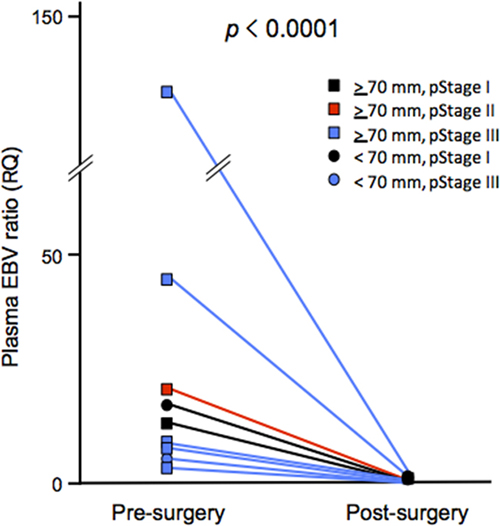 Figure 2: Dynamics of the plasma Epstein-Barr virus (EBV) ratio before and after surgery. Sets of plasma cfDNA before and after surgery were available for nine patients with EBVaGC showing positive results of pre-operative plasma EBV DNA. Squares and circles represent tumors ≥70 mm and those <70 mm, respectively. Black, red, and blue colors indicate pathological stages (pStage) I, II, and III, respectively.