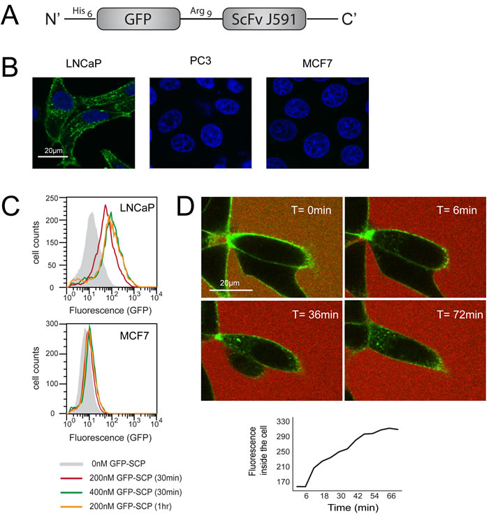 Figure 1: GFP-SCP binds and selectively internalizes into PSMA-overexpressing cells. A. Schematic representation of GFP-SCP. B. LNCaP, PC3 and MCF7 cells were incubated with 25nM GFP-SCP for 5 h. The cells were fixed and stained with anti-GFP antibody (Cy3) and 4, 6-diamidino-2-phenylindole and viewed by laser scanning confocal microscopy. C. LNCaP and MCF7 cells were incubated with GFP-SCP as indicated, then subjected to flow cytometric analysis. D. LNCaP cells were monitored by laser confocal imaging, 0 to 72 min after the addition of 200nM GFP-SCP. Sulforhodamine-B was added to the medium immediately before adding the GFP-SCP, to mark the outside of the cells. The graph shows GFP fluorescence inside the cell, as measured using ImageJ.