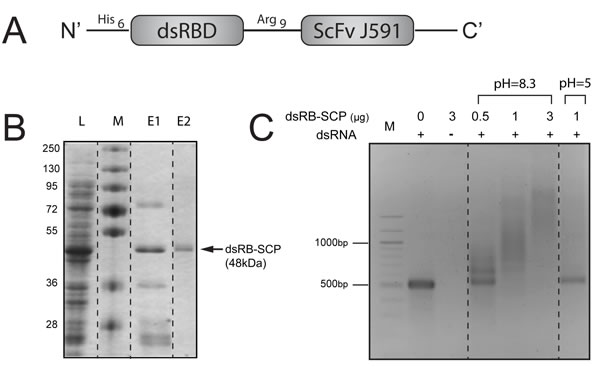 Figure 2: Design, expression and purification of dsRB-SCP. A. Schematic representation of dsRB-SCP. B. Expression and purification of dsRB-SCP: L: Cleared lysate, M: Molecular weight marker, E1: Eluate following IMAC (nickel sepharose column), E2: Purified dsRB-SCP eluted from IEX (ion exchange column). C. Binding of dsRB-SCP to dsRNA. dsRB-SCP (0.5-3µg) was preincubated with 500 bp long dsRNA in binding buffer at pH 8.3 or pH 5, and electrophoresed on a 2% agarose gel. M: 100 bp DNA molecular weight marker. Dashed lines indicate where the pictures of the gels were cut and reorganized.