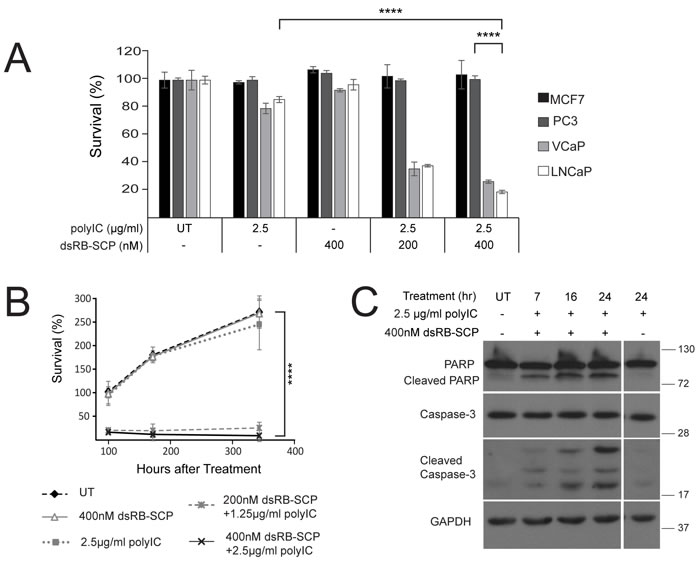 Figure 3: dsRB-SCP/polyIC selectively induces apoptosis of PSMA-overexpressing cells. A. Cells were seeded in triplicate, grown overnight, and treated with dsRB-SCP/polyIC, polyIC alone or dsRB-SCP alone, as indicated, for 100 h. Viability was quantified using the CellTiter-Glo Luminescent Cell Viability Assay (Promega). Results (mean and standard deviation) are representative of two independent experiments (****P ≤ 0.0001, treatment with dsRB-SCP/polyIC of LNCaP vs PC3; ****P ≤ 0.0001 treatment of LNCaP with dsRB-SCP/polyIC vs polyIC alone). B. Surviving cells remained permanently arrested. Cells were seeded in triplicate, grown overnight, and treated as indicated. Medium was replaced and viability was quantified after 100/172/344 h using CellTiter-Glo (****P ≤ 0.0001 dsRB-SCP/polyIC treatment vs UT). Control cells were unable to proliferate beyond 2.5 doublings because they had reached full confluence. C. LNCaP cells were treated for the indicated times with dsRB-SCP/ polyIC or polyIC alone, lysed and subjected to western blot analysis to detect full-length and cleaved Caspase-3 and PARP.