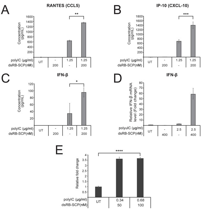 Figure 4: dsRB-SCP/polyIC leads to the secretion of pro-inflammatory cytokines and the recruitment of PBMCs. A.-C. LNCaP cells were treated as indicated for 48 h, after which medium was collected. IP-10, RANTES and IFN-β in the medium were measured by ELISA assays. D. IFN-β transcription was measured by qRT-PCR of LNCaP cells treated as indicated for 4 h. Values are IFN-β mRNA levels, normalized to GAPDH mRNA and expressed as fold change compared to untreated (UT) cells. All assays were conducted in triplicate and data are presented as mean concentration with standard deviation (***P ≤ 0.001, **P ≤ 0.01, *P ≤ 0.05, dsRB-SCP/polyIC treatment vs polyIC alone). Results are representative of two independent experiments. E.. dsRB-SCP/ polyIC induces chemotaxis of PBMCs. LNCaP cells were grown and treated as indicated. 48 h after treatment, the cell medium was transferred to the lower chamber of a Transwell chemotaxis plate. PBMCs were added to the upper chamber, and the plates were incubated for 3.5 h. Then, medium was collected from the lower chamber, in order to quantify lymphocytes that had migrated to the lower chamber. Lymphocytes in the collected medium were quantified by FACS. The number of lymphocytes that had migrated in the treated group is shown as mean fold change with standard deviation, relative to the number of cells that had migrated in the untreated group (****P ≤ 0.0001, dsRB-SCP/polyIC treatment vs untreated (UT)).
