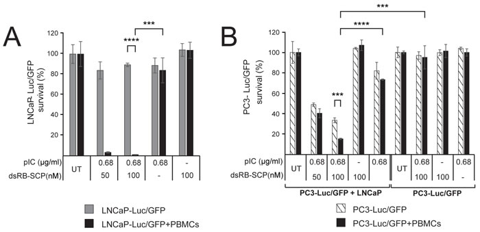 The immune-cell-mediated bystander effect was analyzed using LNCaP-Luc/GFP cells co-cultured with PBMCs: LNCaP-Luc/GFP cells were seeded in triplicate in 96-well plates pre-coated with poly-lysine (10,000 cells/well) and grown overnight. The cells were then treated with dsRB-SCP/polyIC, polyIC alone or dsRB-SCP alone at the indicated concentrations. After 24 hours, freshly isolated PBMCs were added to the culture (1X105 per well). 48 hours later, the survival of LNCaP-Luc/GFP cells was measured based on luciferase activity using the Luciferase Assay System.