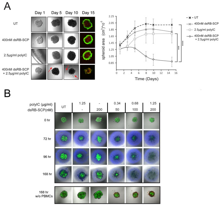 To better predict the clinical efficacy of dsRB-SCP/polyIC we used a tumor spheroid model. Cancer cells cultured as monolayers often show misleading sensitivity to therapeutic agents. Tumors feature cell-cell adhesion and three-dimensional shape, leading to “multi-cellular resistance” (MCR), which cannot be replicated in two-dimensional cultures [71]. Tumor cells cultured as spheroids present a multi-layer cell system that has many features of the three-dimensional tumor and therefore has greater potential to predict clinical efficacy [43, 72, 73]. Treatment of tumor spheroids with dsRB-SCP/polyIC resulted in visible structural damage (loss of integrity), probably due to the loss of adhesion between dead cells (Figure 6A). Adding immune cells to the spheroid model greatly amplified the response and accelerated the tumor disintegration time (Figure 6B). In both monolayer and spheroid cultures, the bystander effects were activated at extremely low doses of polyIC, suggesting that extensive tumor killing can be obtained in vivo, without toxic side effects.