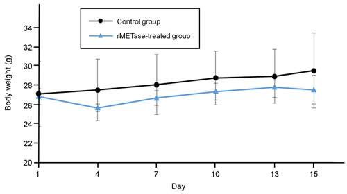 The tumor volume ratio in the rMETase-treated group was significantly smaller from day 10 to 15 compared to the untreated control mice (P < 0.05) (Figure 3). Tumor weight was also significantly smaller in rMETase-treated group (60.6 ± 10.6 mg) than in control group (86.1 ± 6.8 mg) (P < 0.01) (Figure 3). Mouse body weight was not significantly reduced in the rMETase group (Figure 4).