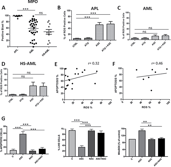 Figure 4: Correlation between apoptosis induced by ASC/ATO and levels of MPO or ROS production. Basal levels of MPO in APL, AML and HS-AML blasts (A); % of ROS positive cells among primary APL blast population (B); % of ROS positive cells among primary AML blast population (C); % of ROS positive cells among primary AML-HS blast population (D); correlation between apoptosis and ROS positive cells in primary APL blasts (E), correlation between apoptosis and ROS positive cells in primary AML blasts (F). NAC protects NB4 cells from ASC-mediated ROS production and induction of cell death. NB4 cells were incubated in the absence (C) or in the presence of either 3 mM ASC, 2 mM NAC or both and evaluated for mitochondria ROS production (MitoSOX labeling), and for viability and apoptosis at 24 hours (G). **p ≤ 0.001 ***p ≤ 0.0001 by.