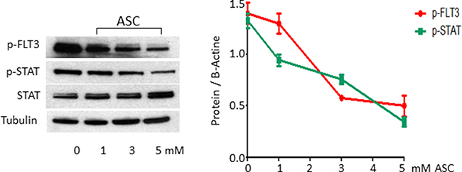 Figure 6: ASC treatment causes inhibition of activated FLT3 signaling. The FLT3-ITD mutated MV4;11 cell line was treated for 24 hours with increasing ASC doses, ranging from 0.2 μmol/L up to 5 μmol/L, and then analyzed by Western blot analysis, using FLT3, p-FLT3, STAT5 and p-STAT5 antibodies.