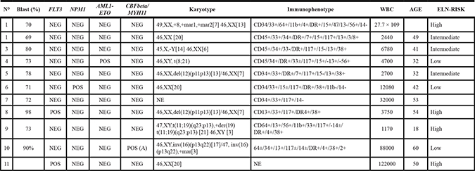 Conventional karyotyping was performed and reported according to the International System for Human Cytogenetic Nomenclature [51]. For molecular diagnostic studies, total RNA was extracted from BM mononuclear cells separated by Ficoll–Hypaque, using the method of Chomczynsky and Sacchi [52]. DNA was extracted using a column-based kit (QIAmp DNA, Quiagen, Hilden, Germany). Samples were characterized for the presence of BCR/ABL, PML/RARA, CBFB/MHY11, RUNX1/RUNX1T1, and DEK/CAN fusion genes, and for NPM1 and FLT3-internal tandem duplication (ITD) mutations using methods reported elsewhere [53–54].