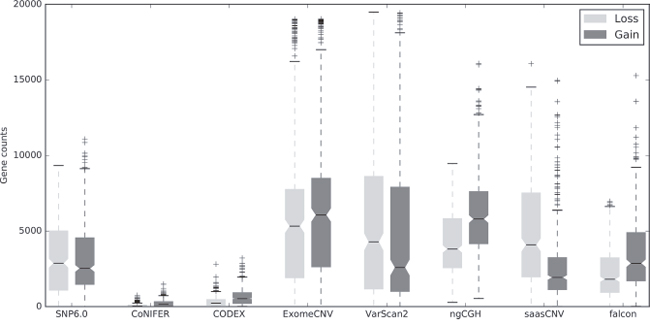Figure 2: Numbers of gene-based copy number gains and losses generated by the WES CNA estimation tools compared to SNP6.0. Boxplots show the total numbers of gene-based copy number gains and losses estimated using the indicated algorithms. Gains are dark and losses are gray. Amplifications were merged with gains, and homozygous deletions were merged with losses.