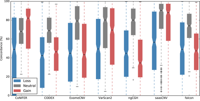 Figure 3: Overlap percentages for the WES-based CNAs and the reference CNA set. The CNA estimations obtained using the seven tools were converted into gene based copy numbers (loss (-2, -1), neutral (0), or gain (1, 2)) and concordance with the SNP6.0 copy number reference was assessed.