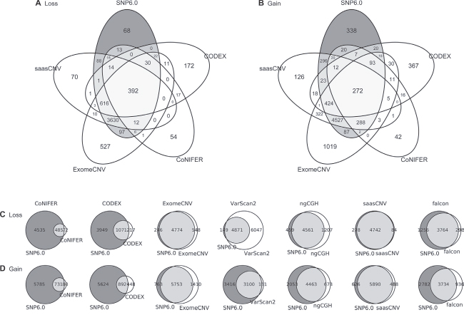 Figure 4: Gene-based Venn diagram. The overlapping genes were calculated in the TCGA.AN.A0FL.01 sample. The Venn diagrams show the overlaps in (A) losses and (B) gains at the gene-level between the four selected CNV calling tools. Overlap between SNP6.0 copy numbers and each of the seven tools for (C) losses and (D) gains.