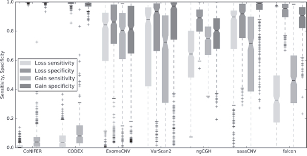 Next, we calculated the sensitivity and specificity of each algorithm using the CNA estimations for all samples. To do this, we assessed whether each estimation was a true positive, true negative, false positive, or false negative using the 19,780 genes for all 419 samples available in SNP6.0. As shown in the boxplot in Figure 5, sensitivity and specificity percentages for saasCNV, ExomeCNV, and VarScan2 were higher than approximately 50%, whereas CODEX and CoNIFER had lower sensitivities. The high specificity of CODEX and CoNIFER reflected the small number of gain or loss estimations they generated. Falcon also showed low sensitivity and high specificity, and the loss sensitivity of saasCNV was much higher than that of the other tools.