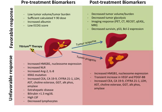 increased CEA, CA 19-9, CYFRA 21-1, CRP, LDH, AST, CHE, GGT, alk phos, amylase and nucleosomes suggest poor outcomes after Y-90 |