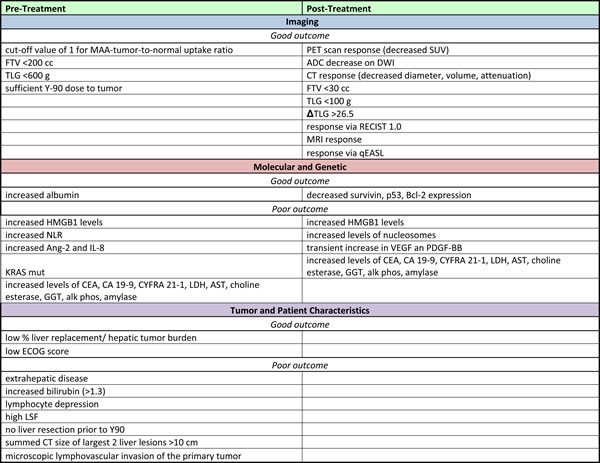 Clinical factors presented in this review have the potential to improve Y-90 patient selection. The most promising of which include known clinical prognostic factors: ECOG status, NLR, Albumin levels, LDH, and tumor burden.