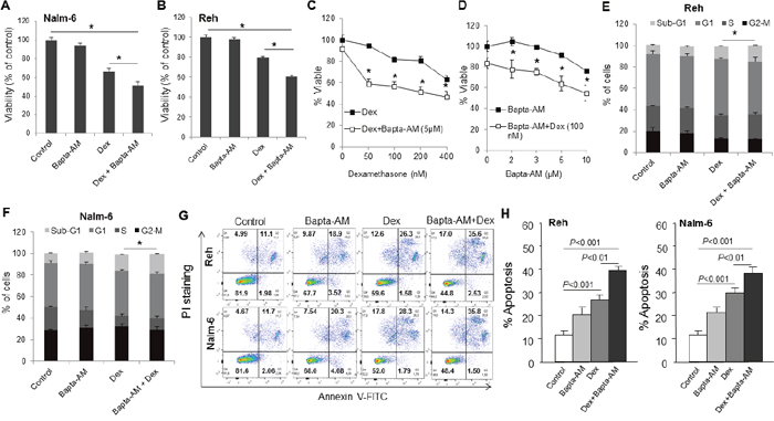 Figure 1: Bapta-AM markedly enhances dexamethasone-induced cell death, cell cycle disruption and apoptosis in ALL cell lines. Nalm-6 (A) and Reh (B) cells were treated with Bapta-AM (5 μM) and dexamethasone (Dex, 100 nM) alone or in combination for 48 h. Cell death was detected by MTT metabolic colorimetric assay. Data are representative of triplicate experiments. (C) ALL Reh cells were treated for 48 h with increasing concentrations of dexamethasone (Dex) alone or in association with Bapta-AM (5 μM). (D) ALL Reh cells were treated for 48 h with indicated concentration of Bapta-AM alone or in association with dexamethasone (Dex, 100 nM). The values of control cells were considered as 100%. Data represent the means ±S.E.M. (n=3). *P<0.05 vs Dex or Bapta-AM alone treatment. Cell cycle distribution (E, F) and apoptosis (G, H) were determined respectively by PI staining and Annexin V/FITC-PI staining followed by FACS analysis. *P<0.05 vs dexamethasone alone treatment (E, F). (H) The percentage of apoptotic cells was calculated by the percentage of annexin V-FITC positive and annexin V-FITC/PI-positive population. Combination index (CI) value < 1 (0.58 in Nalm-6 and 0.45 in Reh cells) indicates that the drugs are significantly synergistic. Data represent the mean ± S.E.M. (n=3).