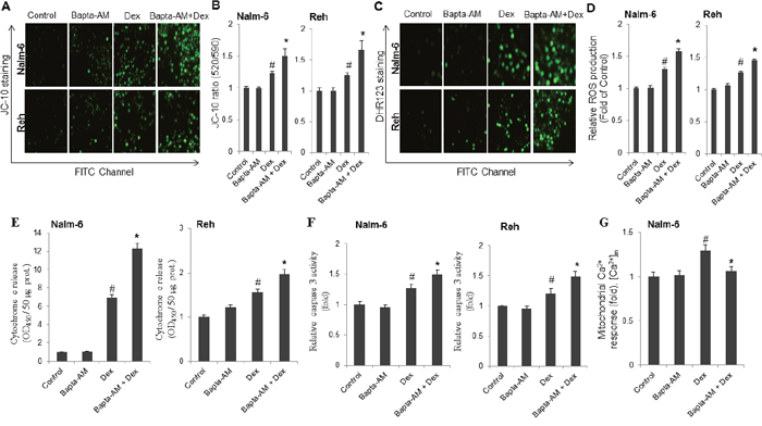 Figure 2: Co-treatment with dexamethasone and Bapta-AM markedly increases mitochondrial membrane potential depolarization, reactive oxygen species production, cytochrome c release and caspase 3 activity in ALL cells. Cells were treated with Bapta-AM (5 μM) and dexamethasone (Dex, 100 nM) alone or in combination for 24 h. Images acquired with Zeiss Axiovert 200M fluorescence microscope after JC-10 (A) and DHR 123 (C) staining using FITC channel. The fluorescence intensity for both mitochondrial membrane potential changes (B) and intracellular reactive oxygen species generation (D) was measured with SAFAS Xenius XC Spectrofluorometer. The bar graphs of mean fluorescence intensity representing cytochrome c release (E) caspase-3 activity (F) and mitochondrial calcium (G). Data represent the mean ± S.E.M. (n=3). *P<0.05 vs dexamethasone alone treatment; #P<0.05 vs control.