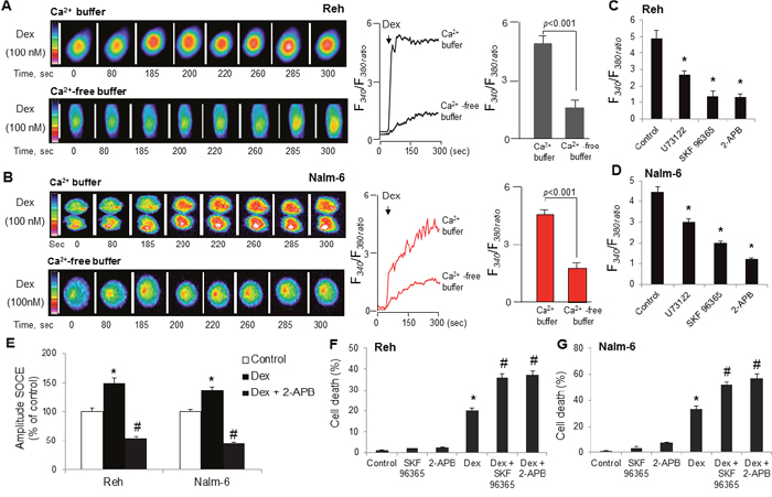 Figure 3: Dexamethasone stimulates intracellular Ca2+ release and SOCE and co-treatment with dexamethasone and SOC inhibitors markedly enhances ALL cells death. Cells were loaded with Fura-2/AM, and the changes in intracellular Ca2+, [Ca2+]i, (F340/F380) were monitored. (A, B) The colored time-lapse images and the graphical representation show the changes in [Ca2+]i evoked by dexamethasone (Dex), in Reh and Nalm-6 cell lines, respectively, in Ca2+-containing and in Ca2+-free buffer. (C, D) ALL cells before exposure to 100 nM dexamethasone (Dex) in Ca2+ buffer were preincubated (20 minutes) with U73122 (10 μM), SKF96365 (10 μM) or 2-APB (10 μM). Data are mean ± SEM (n = 5). (E) Effect of dexamethasone (Dex) on SOCE activation in ALL cells. ALL cells ER calcium stores were depleted with thapsigargin (TG, 1 μM) in calcium-free suspension medium in the presence or absence of 2-APB (10 μM), cells were then treated without or with 100 nM dexamethasone, followed by addition of 1.8 mM CaCl2. Data are mean ± SEM (n = 3). Reh (F) and Nalm-6 (G) cells were treated with SOC inhibitors (SKF 96365, 5 μM and 2-APB, 5 μM) and dexamethasone (100 nM) alone or in combination for 48 h. Cell death was detected by MTT metabolic colorimetric assay. Data are representative of triplicate experiments. *p <0.001 vs. control; #p <0.001 vs. Dex.