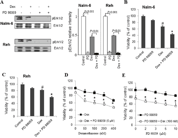 Figure 5: Pharmacological inhibition of ERK1/2 potentiates dexamethasone sensitivity in ALL cells. ALL cells were preincubated (20 min) with PD98059 (5 μM) and then exposed to 100 nM dexamethasone (Dex) for 5 min. Cell lysates were subjected to western blotting analysis with the indicated antibodies, along with quantification (A). Nalm-6 (B) and Reh (C) cells were treated with PD98059 (5 μM) and dexamethasone (100 nM) alone or in combination for 48 h. Cell death was detected by MTT metabolic colorimetric assay. Data are representative of triplicate experiments. (D) ALL Reh cells were treated for 48 h with increasing concentrations of dexamethasone (Dex) alone or in association with PD 98059 (5 μM). (E) ALL Reh cells were treated for 48 h with indicated concentration of PD98059 alone or in association with Dex (100 nM). The values of control cells were considered as 100%. Data represent the means ±S.E.M. (n=3). *P<0.05 vs PD 98059 or Dex alone treatment; #P<0.05 vs control.