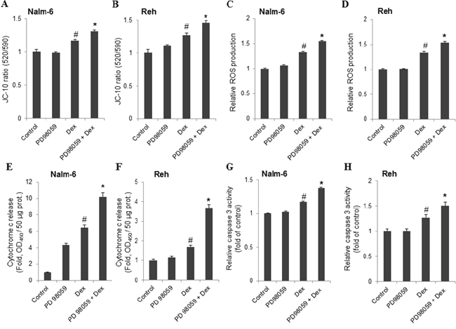Figure 6: MEK inhibitor, PD98059, enhances dexamethasone-induced apoptosis in ALL cells. ALL cells were treated with PD98059 (5 μM) and dexamethasone (Dex, 100 nM) alone or in combination for 24 h. The fluorescence intensity for mitochondrial membrane potential changes (A, B), intracellular reactive oxygen species generation (C, D), cytochrome c release (E, F) and caspase 3 activity (G, H) was measured with SAFAS Xenius XC Spectrofluorometer. Data represent the mean ± S.E.M. (n=3). *P<0.01 vs Dex alone treatment; #P<0.05 vs control.