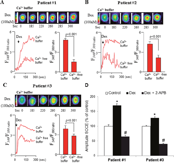 Figure 7: Dexamethasone stimulates intracellular Ca2+ release and SOCE in primary blasts from ALL patients. Primary blasts were loaded with Fura-2/AM, and the changes in intracellular Ca2+, [Ca2+]i, (F340/F380) were monitored. The colored time-lapse images and the graphical representation show the changes in [Ca2+]i evoked by dexamethasone (Dex), respectively, in Ca2+-containing and in Ca2+-free buffer (A, B, C). (D) Effect of Dex on SOCE activation. SOCE was monitored as Figure 3. (Data are mean ± SEM (n = 5). *p <0.001 vs. control; #p <0.001 vs. Dex.