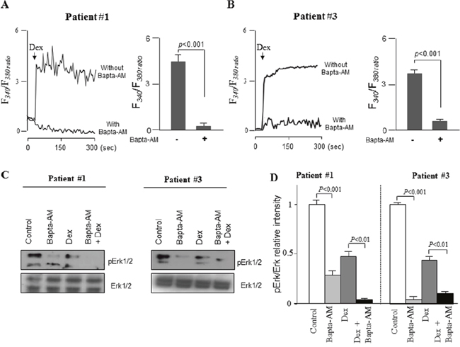 Figure 8: Bapta-AM potentiates dexamethasone-induced inhibition of ERK1/2 signaling by chelating Ca2+ signaling in primary blasts from ALL patients. (A, B) Primary blasts were exposed to 100 nM dexamethasone (Dex) with or without preincubated (20 minutes) with Bapta-AM (5 μM) in Ca2+ buffer and the changes in [Ca2+]i were monitored as Figure 5. (C) ALL blasts were preincubated (20 min) with Bapta-AM (5 μM) in Ca2+ buffer and then exposed to 100 nM Dex for 5 min. Cell lysates were subjected to western blotting analysis with the indicated antibodies, along with quantification (D). Data represent the mean ± SEM (n=3).