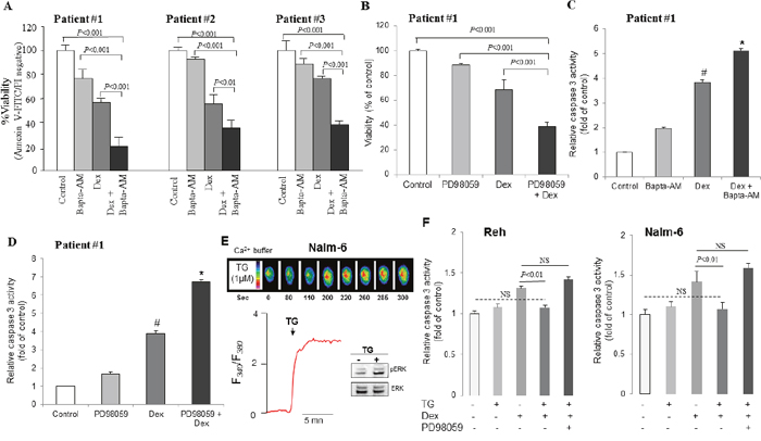 Figure 9: Dexamethasone-induced apoptosis is enhanced by chelating Ca2+ signaling and inhibition of ERK1/2 pathway in primary blasts from ALL patients. (A) Apoptotic cells were measured by annexin V/FITC-PI staining followed by FACS analysis after 48 hours of treatment in ALL blasts. The percentage of cell viability was calculated by annexin V-FITC negative and PI-negative population and the values of control cells were considered as 100%. (B) Cell viability was detected by MTT metabolic colorimetric assay. The values of control cells were considered as 100%. Data represent the means ±SEM of triplicates. (C, D) Caspase 3 activity was measured with SAFAS Xenius XC Spectrofluorometer. *P<0.01 vs Dex alone treatment; #P<0.05 vs control. Data are mean ± SEM (n = 8). (E) Effect of thapsigargin (TG, 1 μM) on the changes in intracellular Ca2+ and ERK1/2 phosphorylation. (F) Effect of TG (100 nM) on Dex-induced caspase 3 activity. Data are mean ± SEM (n = 3).