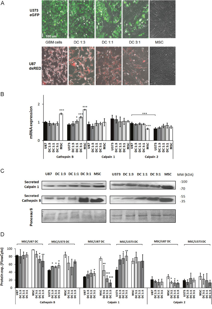 Figure 2: Expression of the cysteine proteases cathepsin B, calpain1 and calpain2 in GBM cells, MSCs and their direct co-cultures. (A) MSCs and GBM cells (U87, U373) monocultured or in direct co-cultures (DC) at 3 different ratios, were grown for 72 h as monolayers and analyzed. (B) Cathepsin B, calpain1 and calpain 2 mRNA levels in U87 cells, U373 cells, MSCs, and in their direct co-cultures (DC) as determined by qPCR. (C) Detection of secreted cathepsin B and calpain1 in culture medium of MSCs, U87 cells (left), U373 cells (right) and their co-cultures (DC) at different ratios, using Western blotting. Western blots were stained with Ponceau S to confirm equal protein loading. (D) Cathepsin B, calpain1 and calpain2 protein expression in MSCs and GBM cells grown as monocultures and direct co-cultures at different ratios, analyzed by flow cytometry. Data are means ± SD. * P <0.05, ** P <0.01, *** P <0.001.
