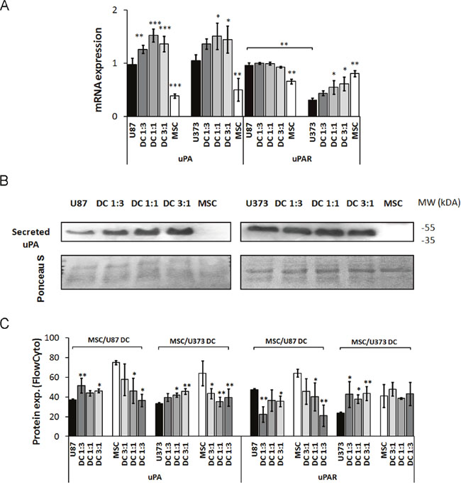 Figure 3: Expression of serine protease urokinase-type plasminogen activator (uPA) and its receptor (uPAR) in GBM cells, MSCs and their co-cultures (DC). MSCs and GBM cells were mixed in different ratios, grown for 72 h as monolayers and analyzed. (A) uPA and uPAR mRNA levels in U87 cells, U373 cells, MSCs and their direct co-cultures at different ratios, as determined by qPCR. (B) Detection of uPA secreted into the cell medium of MSCs, U87 cells (left), U373 cells (right) and their co-cultures (DC) at different ratios, as analyzed by Western blotting. The Western blots were stained with Ponceau S to confirm equal protein loading. (C) uPA and uPAR expression analyzed in GBM cells and MSCs grown as monocultures and co-cultures at different ratios, as analyzed by flow cytometry. Data are means ± SD. * P <0.05, ** P <0.01, *** P <0.001.