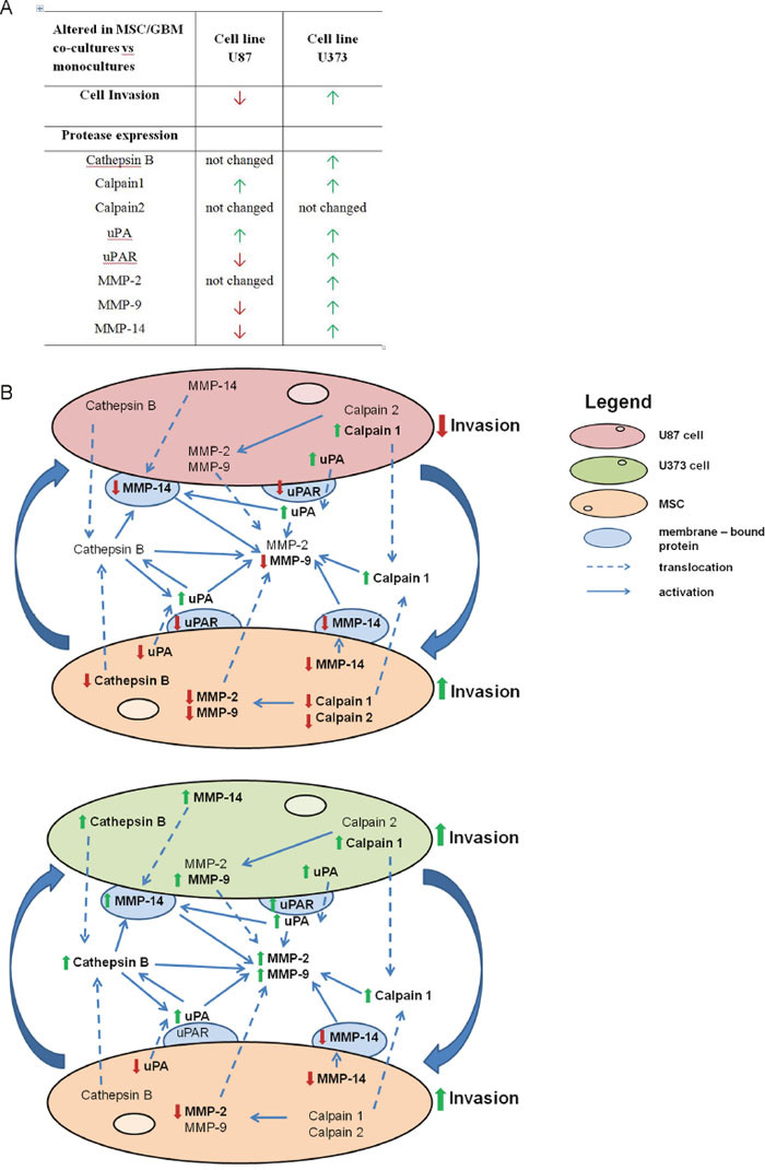 Figure 5: Alterations in invasion and the protease expression in GBM cells and MSCs upon co-culturing. (A) Changes in invasiveness and the candidate protease expression in GBM cells after co-culturing with MSCs are presented in the table. Red and green arrows indicate lower and higher invasion of GBM cells from MSC/GBM co-cultures, respectively, compared with monocultures. Similarly, red and green arrows indicate decreased and increased expression, respectively, at any of the levels of the candidate proteases, compared with monocultures. (B) The scheme shows the presentation of the effects of MSC/GBM co-culturing on the protease expression, involved in invasion-associated proteolytic cascade, in the respective cells and their co-culture media. The upper part of the scheme represents direct cross-talk of U87 cells with MSCs, resulting in decreased invasion of U87 cells, correlating with decreased expression of uPAR and MMP-14 and secretion of MMP-9. Simultaneously, MSC invasion was increased in spite of decreased expression of all the proteases. The lower part of the scheme shows that enhanced U373 invasion was associated with increased levels of all proteases, except calpain2. This shows that MSCs trigger opposite response of two types of GBM cells with respect to invasion, which is associated with different pattern of proteases expression. The lowest part of the scheme shows that MSC/U373 cell cross-talk also results in increased MSC invasion, downregulation of uPA, MMP-9 and -14 and not altered expression of other tested proteases. Alterations of invasion and proteases are shown as bold red arrows (down-regulation) and green arrows (up-regulated).