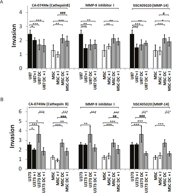 Figure 6: Invasion of DiO/DiI-labelled MSCs and GBM (U87 dsRED, U373 eGFP) cells from spheroids upon treatment with selective inhibitors of cathepsin B (2 μM), MMP-9 (100 nM) and MMP-14 (10 μM). Generated monospheroids (MSCs, U87, U373) and mixed spheroids were incubated in laminin-coated wells and treated with protease inhibitors or control (0.1% DMSO). (A) Invasion (invasion distance/ spheroid diameter) of MSCs and U87 cells from spheroids in the presence of protease inhibitors or control medium, measured after 72 h. (B) Invasion of MSCs and U373 cells from spheroids in the presence of protease inhibitors or control medium after 72 h. Data are means ± SD. * P <0.05, ** (++, ##) P <0.01, *** (+++, ###) P <0.001.