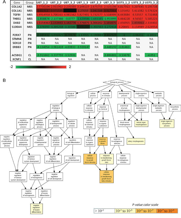 Figure 8: U87 and U373 cells differ in expression of mesenchymal genes and genes involved in response to growth factors, neuron differentiation, developmental and metabolic processes. (A) Expression of 12 Behnan's genes [35] in U87 and U373 cells. These 12 genes (COL1A2, COL1A, TGFBI, THBS1, DAB2, S100A4, P2RX7, STMN4, SOX10, ERBB3, ACSBG1 and KCNF1) alone can subtype the GBM into 3 main subtypes: mesencyhmal (MES), proneural (PN) and classical (CL). Genes with the expression that was filtered out during quality control are denoted with NA. (B) Differentially expressed genes between U87 and U373 cells were functionally analyzed using Gene Ontology enRIchment anaLysis and visuaLizAtion tool (GOrilla) [36]. 294 genes with a significantly different standardized expression values between the two cell lines were inserted into GOrilla in order to determine the enriched pathways.